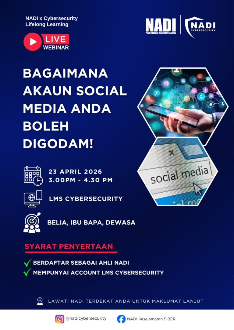 📢 JEMPUTAN WEBINAR LIVE 📢 Assalamualaikum & Salam Sejahtera, Anda dijemput untuk menyertai webinar menarik anjuran NADI x Cybersecurity Lifelong Learning: 🔐 Bagaimana Akaun Social Media Anda Boleh Digodam! 🗓 Tarikh: 23 April 2026⏰ Masa: 3.00 PM – 4.30 PM💻 […]