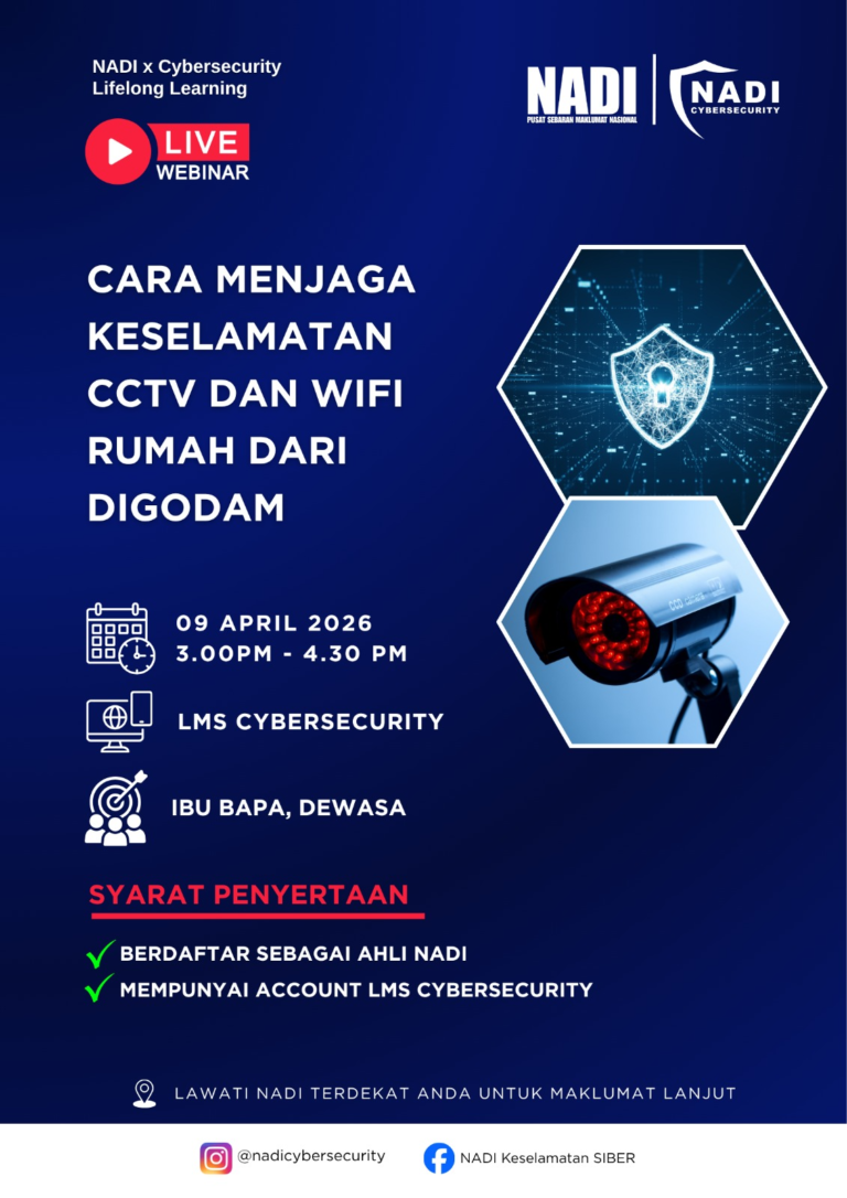 Assalamualaikum,salam sejahtera dan salam syawal Tuan/Puan dijemput untuk menyertai Webinar NADI x Cybersecurity Lifelong Learning seperti ketetapan berikut: π Tajuk: Cara Menjaga Keselamatan CCTV dan WiFi Rumah dari Digodamπ Tarikh: 09 April 2026π Masa: 3.00 PM β 4.30 PMπ» Platform: […]